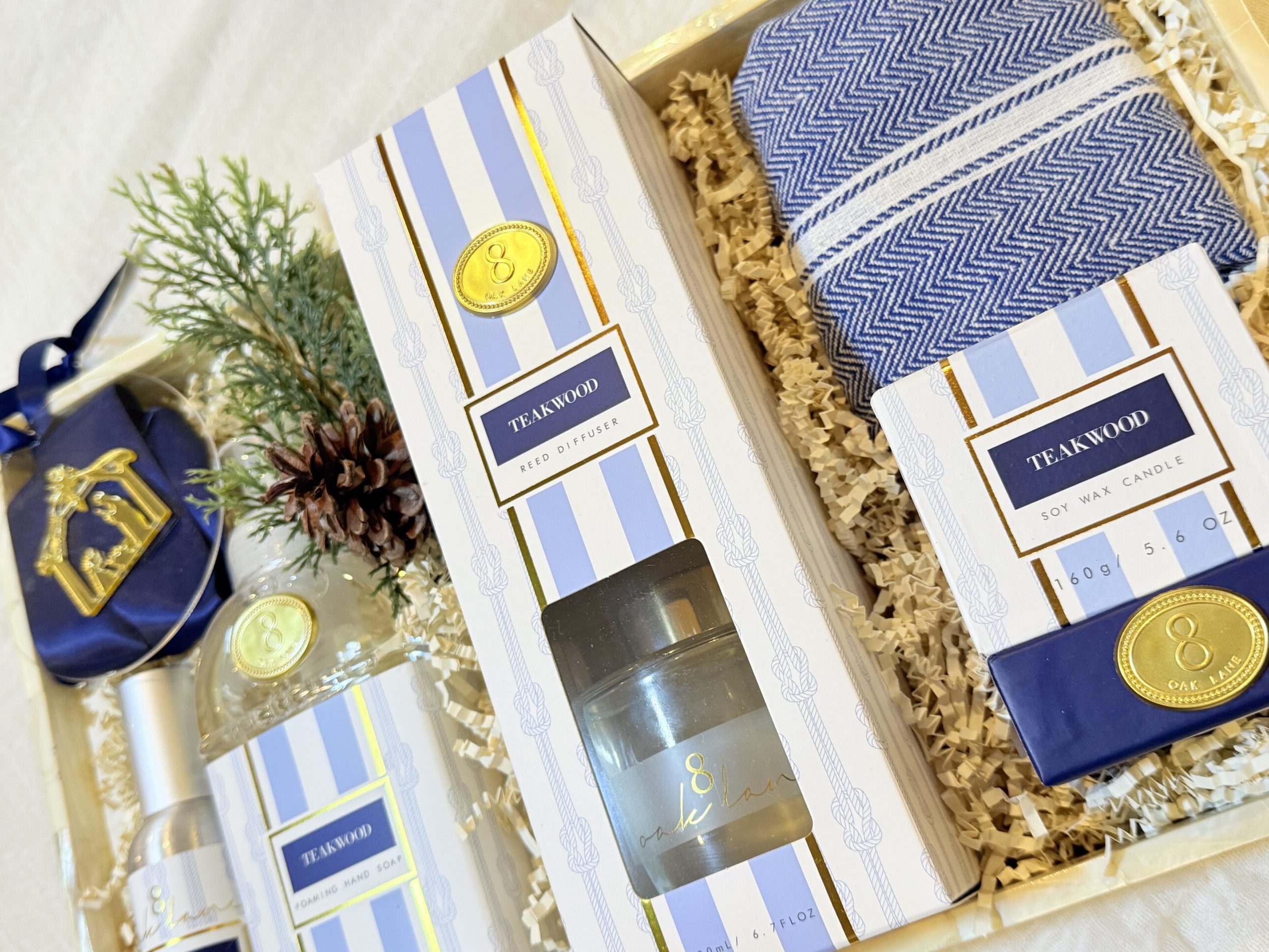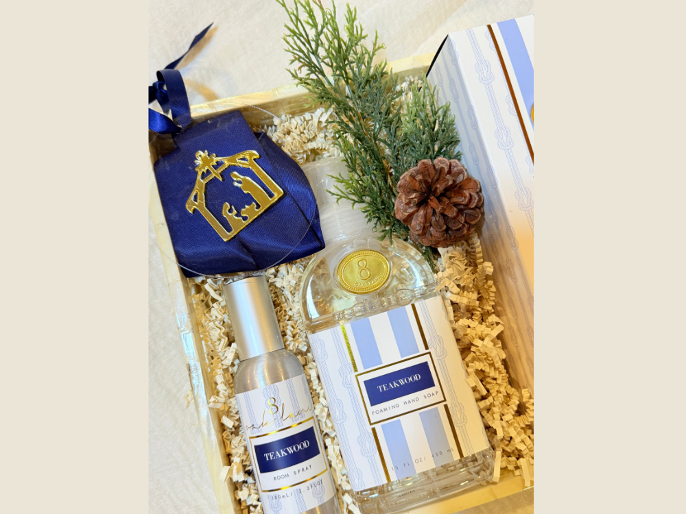 Elevate everyday moments with this sophisticated gift bundle, thoughtfully curated in a gorgeous mother of pearl decorative tray. Inside, you’ll find a premium soy wax candle, a refreshing room spray, and a luxe reed diffuser—each crafted to fill any space with lasting fragrance. A soft, herringbone hand towel adds a touch of everyday elegance, while a the acrylic ornament with gold nativity is a subtle holiday detail. This gift arrives beautifully presented, ready for effortless gifting.